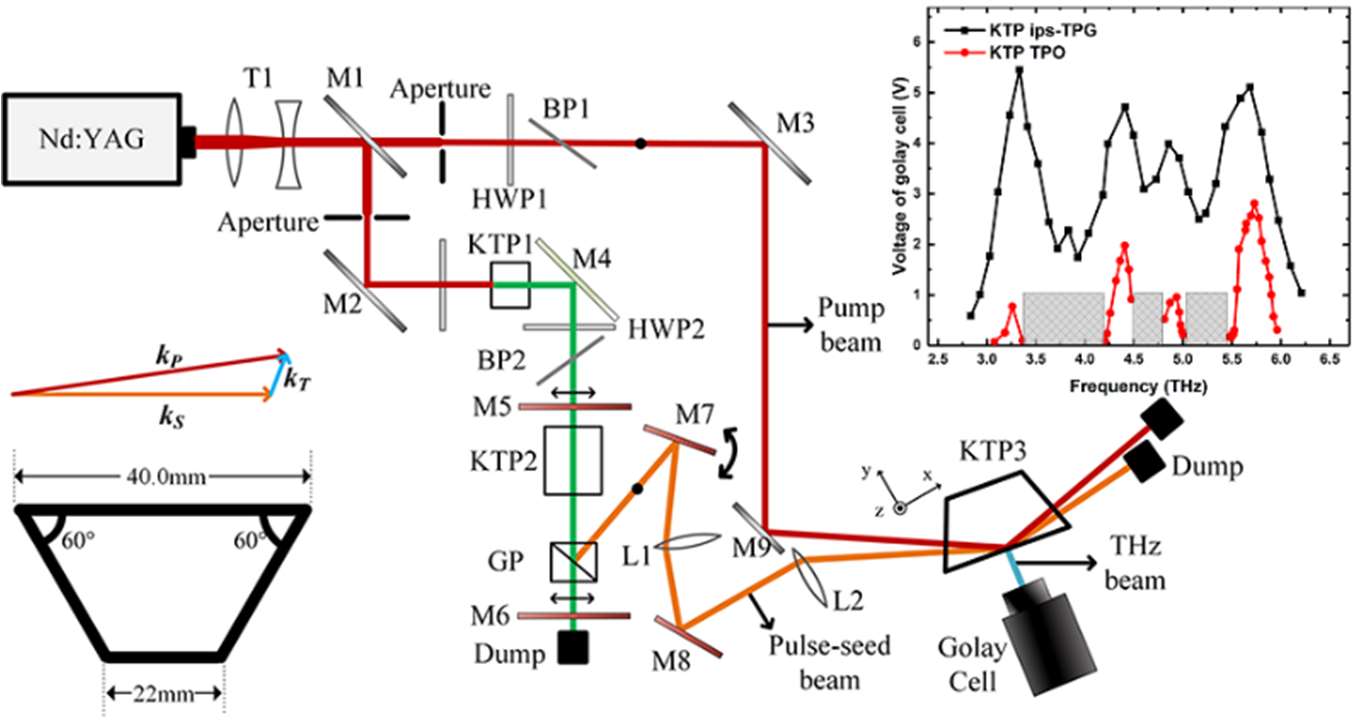 实验室提出利用脉冲种子注入式太赫兹产生技术,在不同频率增强受激电磁耦子散射过程与参量放大过程,实现连续调谐输出和输出能量的增强。搭建基于KTP 晶体的脉冲种子注入式太赫兹参量产生器,实现了2.93-6.21THz 范围内的连续调谐THz 输出,在3.33、3.83、4.41、4.85 和5.69THz 五个输出峰值处最高单脉冲能量分别达到6.27、2.62、5.43、4.59 和5.88μJ。该成果实现了连续宽带调谐高能量输出太赫兹参量产生器,为物质波谱检测提供了一种新型太赫兹辐射源。
