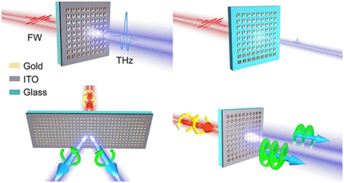 实验室与香港大学等单位合作,研发了基于介电常数近零 (Epsilon-near-zero, ENZ)的复合非线性超表面THz IGM 器件。该非线性超表面由金属纳米结构和氧化铟锡(ITO)薄膜组成,利用金属和ITO 薄膜的非线性效应产生THz 波、利用金属纳米结构的等离子体谐振与ITO 薄膜ENZ 模式间的耦合场增强效应来提升THz波的产生效率、利用金属纳米结构对非线性响应的局域可设计性对产生THz 波的偏振和波前进行同步调控,最终制成多种THz IGM 器件,所制备出ENZ 复合非线性超表面将THz 波的产生效率提升近4 个数量级。该成果有利于THz 系统的小型化和功能化。